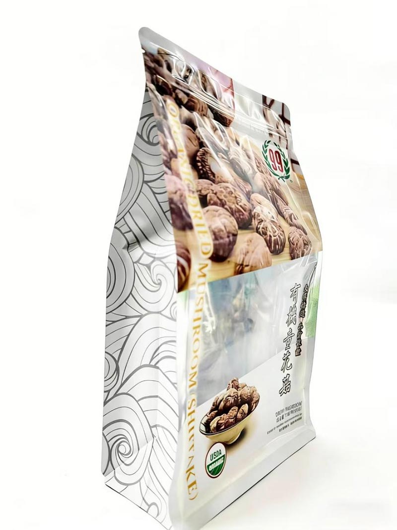 Вибір упаковки безпосередньо впливає на зберігання та товарний вигляд сухофруктів. Основні типи упаковки, доступні на ринку, включають тристороннє зварювання, чотиристороннє зварювання, стоячі пакети та восьмисторонні зварювальні пакети. Серед них найкращим вибором є восьмисторонній герметичний мішок. Порівняно з іншими типами пакетів, пакет з восьми сторонами має вісім запечатаних країв, що дозволяє йому стояти вертикально з плоским дном, що робить його ідеальним для демонстрації на полицях магазинів. Цей тип сумки має п’ять сторін для брендування, і її можна налаштувати за допомогою різноманітної графіки, що робить її придатною як для роздрібної торгівлі, так і для електронної комерції.
